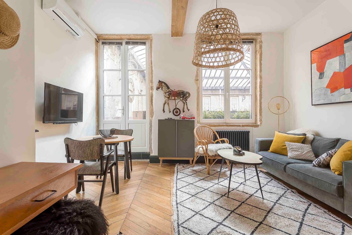 Niché sur la presqu'île en plein centre de Lyon, profitez de cet appartement aux poutres et pierres apparentes entièrement rénové à proximité immédiate de la charmante place sathonay et à quelques pas de la place des terreaux. Idéal pour celles et ceux qui souhaitent explorer à pieds les principaux sites touristiques, les restaurants, les pubs, sortie culturels, nocturnes de Lyon que vous soyez en famille, entre amis ou professionnels.