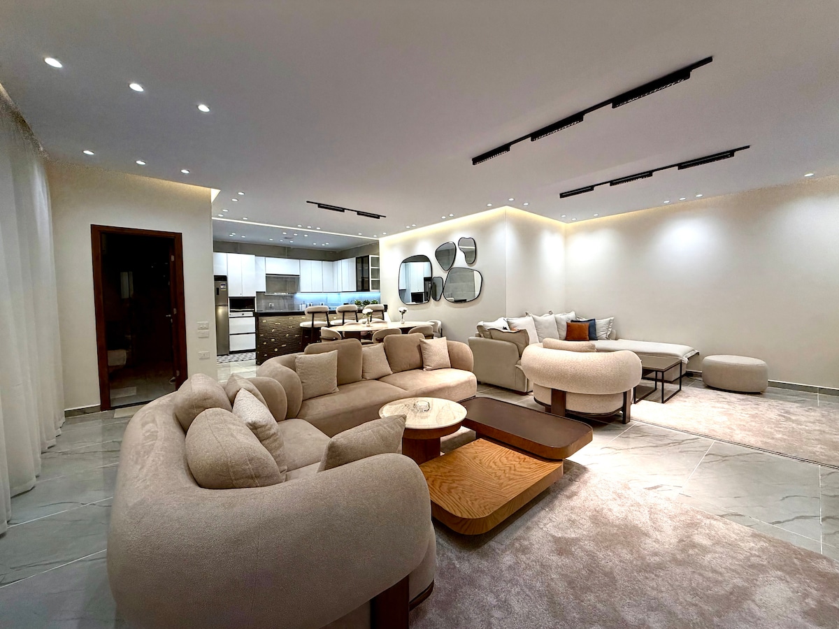 Apartamento de lujo bellamente diseñado. Planta privada de 2400 pies cuadrados. Una escapada perfecta para familias/personas que buscan una estancia limpia y bien amueblada en Ard El Golf, Heliópolis, El Cairo. Una vista panorámica al jardín junto con una zona soleada y espaciosa con aire acondicionado (frío y calor). Servicios inspirados de alto nivel. Barrio acogedor. La estación de metro está a 8 minutos a pie, los famosos centros comerciales y las tiendas de comestibles están bastante cerca. En general, nada es mejor que una ubicación segura única.