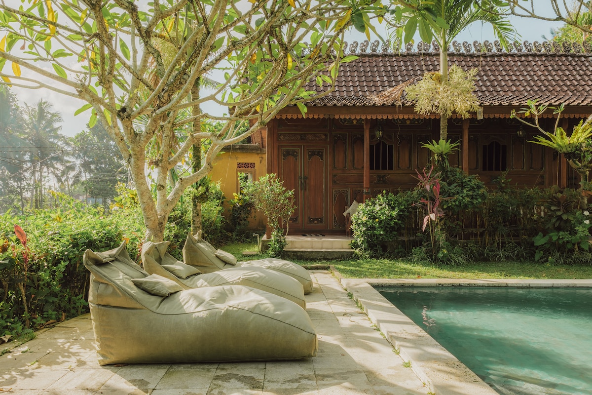 CASA PRIVADA ENTERA, con piscina privada, 2 suites serenas y espaciosas, rodeadas de exuberantes campos de arroz verdes y vistas a la jungla. A solo 3 minutos desde el centro de Ubud, pero se siente como a kilómetros de distancia. Un mundo lejos del ajetreo de la vida cotidiana. TEN EN CUENTA QUE se puede llegar a 15 minutos a pie o a 3 minutos en moto desde el corazón de Ubud (LA ÚLTIMA PARTE DEL CAMINO SOLO ES ACCESIBLE A PIE O MOTOCICLETA).