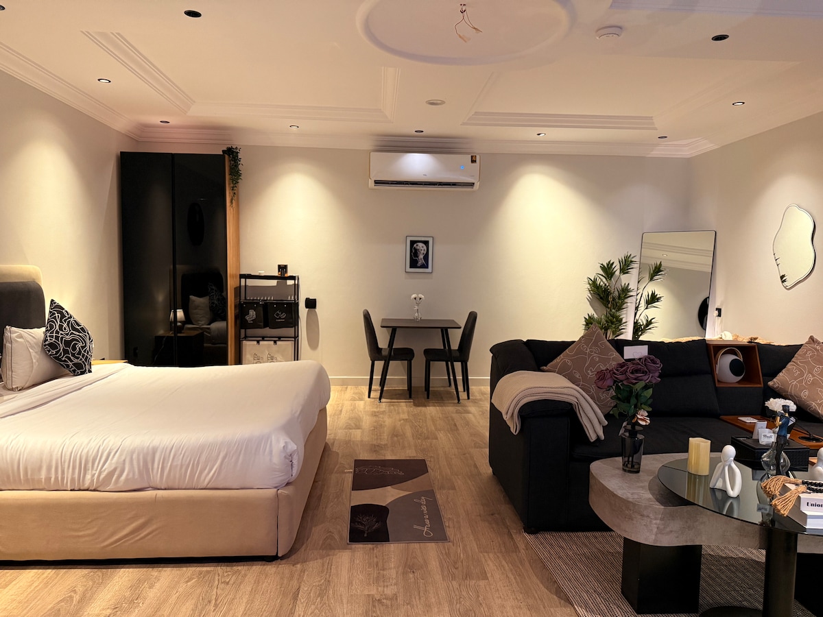 Djerba de alta gama en un elegante estudio de entrada inteligente Alta privacidad. A 4 minutos de Prince Sultan, a 6 minutos del centro comercial Yowok y a 15 minutos del Aeropuerto Internacional de Jeddah. - Este estudio de estilo moderno cumplirá con todos Todo lo que necesitas para las fiestas. - El estudio tiene una habitación totalmente amueblada. Pequeño, y un baño. - El estudio tiene las necesidades vacacionales más importantes, como un televisor de 65 pulgadas, Internet 5G, nevera, cafetera y mucho más. - Llegada autónoma fácil de usar. (Respeta el nivel de ruido).