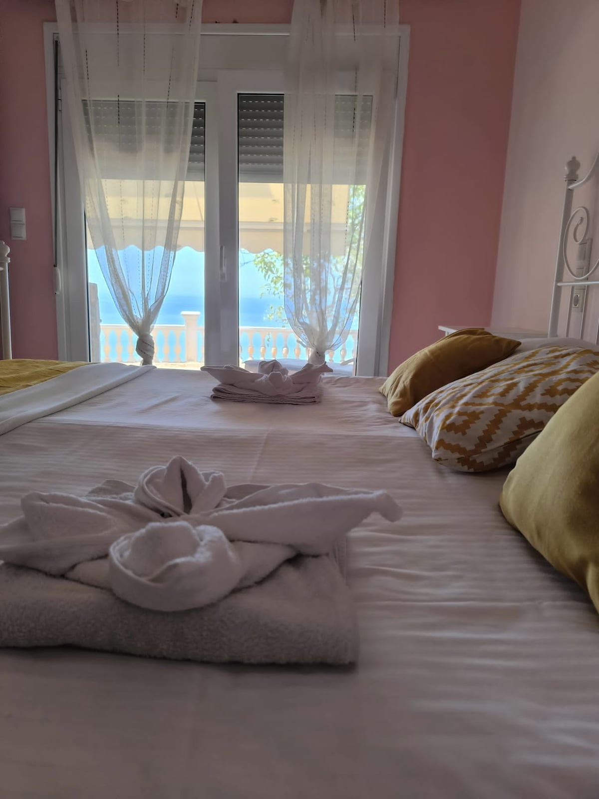 This property includes a double bedroom with en suite bathroom and window that faces the garden, another double bedroom, an extra bathroom with shower enclosure, a wonderful setting of fully equipped kitchen/dining table and living room all in one spacious environment. A big balcony overlooking the bay of Lakka and the unique sunsets of Paxos, and a jacuzzi in the private garden.