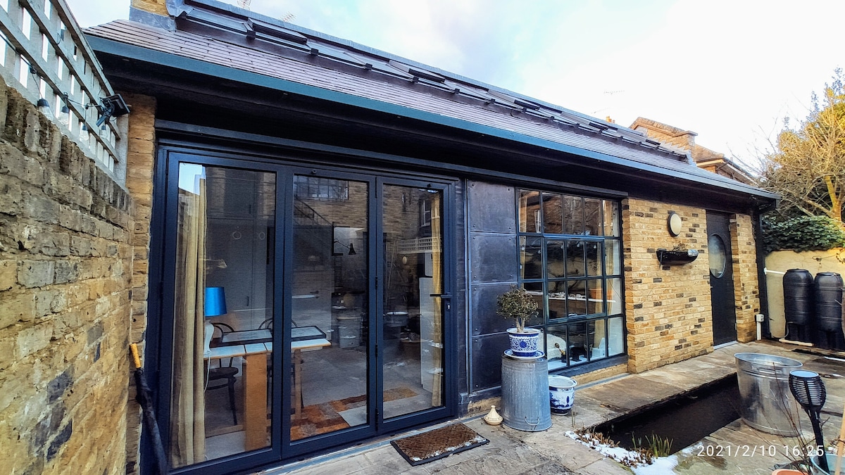 Relájate en este elegante estudio de diseño en el último piso de una casa victoriana en West London junto al río Támesis con excelentes conexiones de transporte. Este espacio luminoso, compacto, privado y autónomo tiene su propia puerta principal independiente y cuenta con cocina, ducha e inodoro separados, escritorio y una cama con colchón y ropa de cama de alta calidad. El espacio ha sido diseñado para sentirse y funcionar como una habitación de hotel, pero con la comodidad de una cocina y una soleada terraza en la azotea orientada al sur.