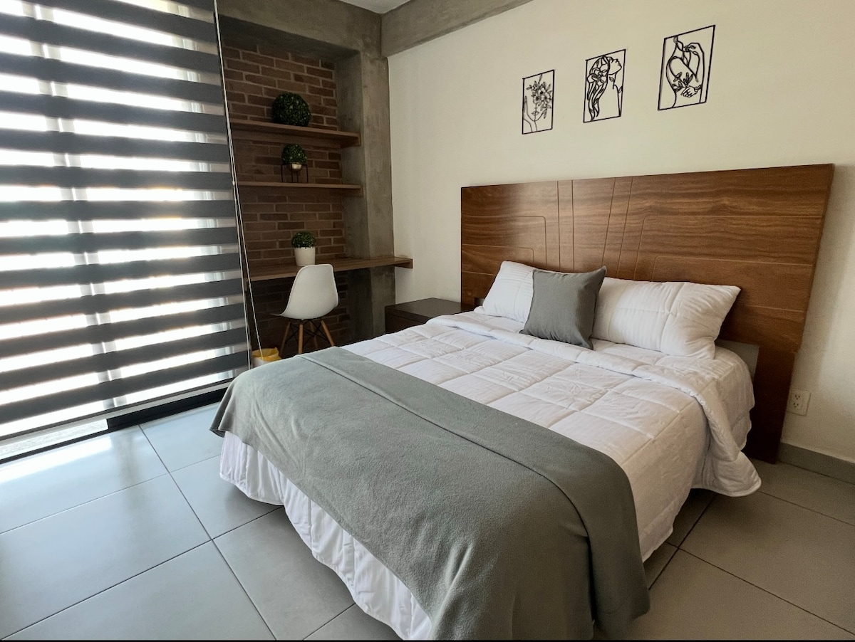 Disfruta la comodidad de hospedarte cerca del centro histórico de Guadalajara (5-10 minutos en auto) dentro del nuevo desarrollo "Acervo Central Living". Departamento con excelente ubicación para acortar los trayectos a los puntos de interés más importantes. Aprovecha las amenidades: roof garden, sala de coworking, patio central, lobby, kids zone, estacionamiento subterráneo para 1 auto y bicicletas, elevador. Descuentos para estancias semanales y mensuales disponibles.