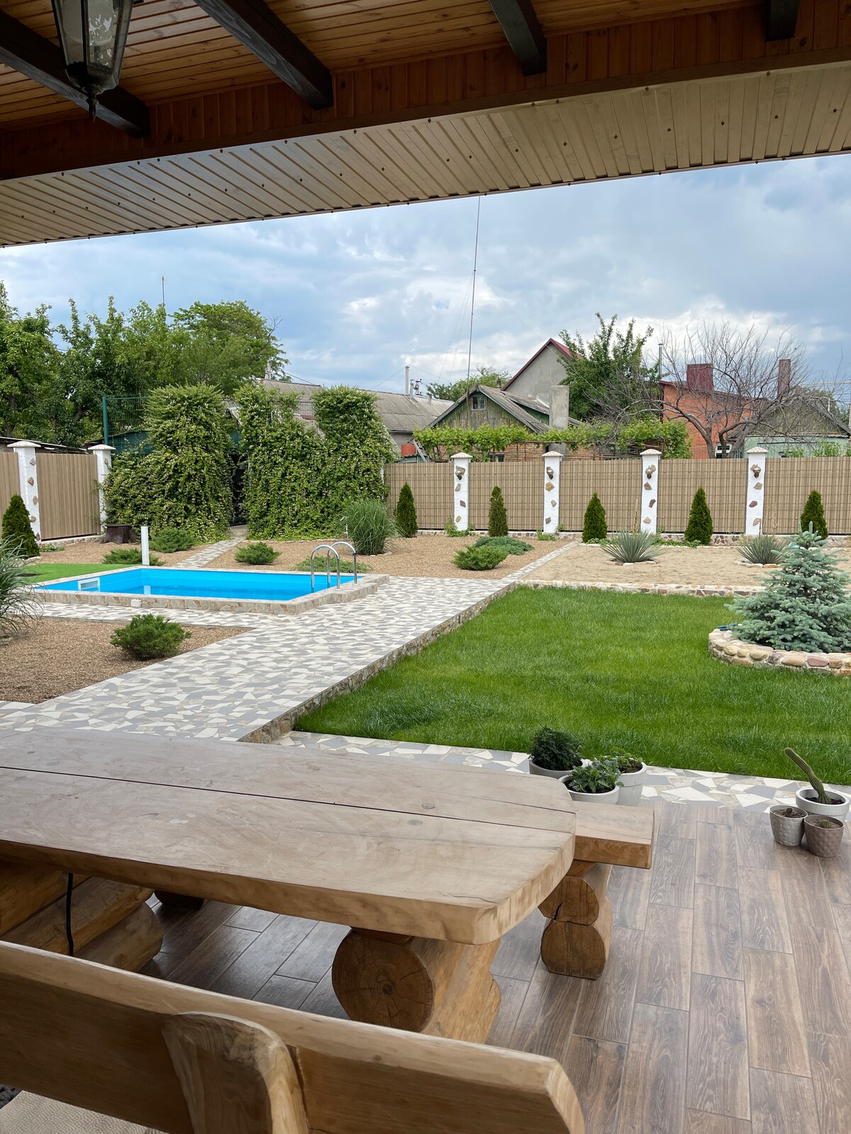 Parte de la casa en alquiler con entrada privada, piscina, barbacoa y terraza (solo compartes terraza y piscina con nosotros) Es un gran estudio con aire acondicionado (45 metros cuadrados), cocina bien equipada, baño, cama tamaño king (si no eres pareja, ponemos una cama adicional para ti), Internet de alta velocidad, con vistas a la piscina y al jardín. Siempre hay agua caliente y calefacción. Si es necesario, podemos ayudarte a alquilar un auto, excursiones, ayudarte con la propiedad de la ciudadanía. Podemos cocinar para ti comida saludable.