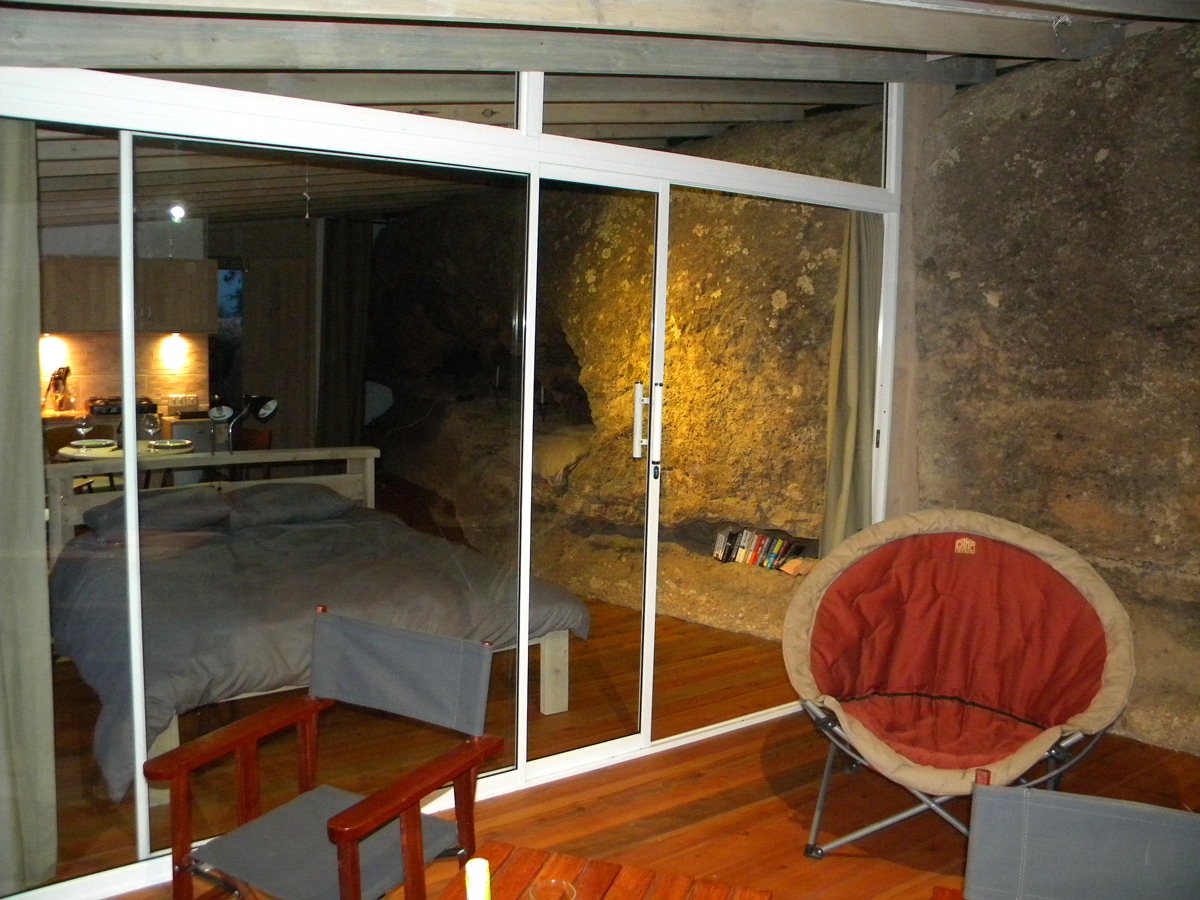 The farm's fourth cottage is built of rock between two boulders. The interior is very comfortably furnished with ceder-clad walls and ceder floors, two comfortable 3/4 beds, a fireplace, kitchenette and a bathroom clad in rock with sliding doors opening onto the landscape. The cottage faces north with a view of Sneeuberg. There is a large sliding door opening onto the patio with a retractable awning and a braai to enjoy the extraordinary views in every direction.