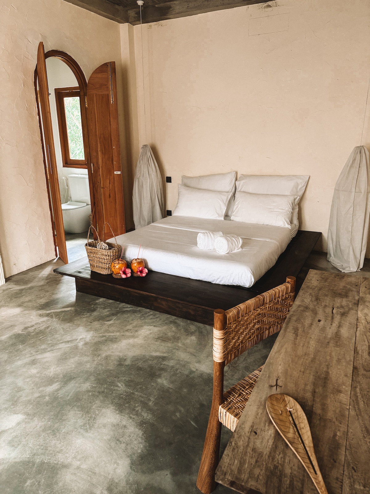 Ubicada en la parte delantera de la propiedad, la habitación Queen 2 cuenta con hermosas puertas francesas que conducen a una terraza compartida. Luminosa y espaciosa, tiene capacidad para dos personas en una cama tamaño queen y cuenta con un pequeño pero funcional baño privado con ducha. La habitación está llena de todos los detalles importantes y comodidades estándar: sábanas de alta calidad súper suaves, toallas de felpa, duchas de efecto lluvia con agua caliente solar, aire acondicionado, techos altos, wifi gratuito y vistas a la selva. El desayuno está incluido en la tarifa.