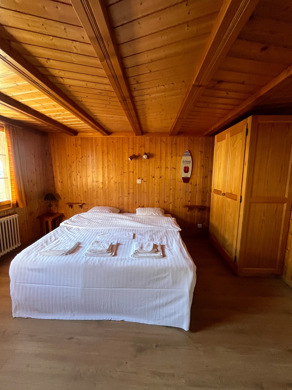 Chambre familiale, comprenant un lit double pour les parents et un lit pour enfant avec salle de bains inclus. Les toilettes sont privatives à l’extérieur de la chambre. La chambre dispose d’une télévision ainsi qu'une vue sur la nature. Idéale pour partager un séjour agréable en famille au cœur de la montagne.
