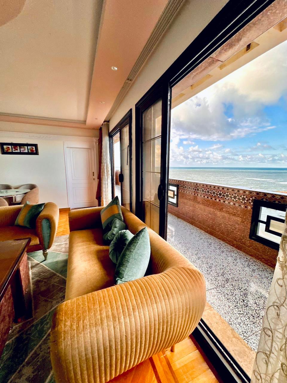 Situado en el área deportiva de Alejandría, este lujoso apartamento único de 2 dormitorios frente al mar con increíbles vistas donde la belleza del Mediterráneo ocupa un lugar central, cerca de todas las atracciones. - 2 dormitorios cada uno con cama Queen. - Salón: sofá con un juego de 3 plazas (convertible en cama), espacio abierto conectado a un comedor integrado. - Balcón: balcón de 14 metros cuadrados con vistas panorámicas del Mitterrandian es el lugar perfecto para ver la puesta de sol. - Baño de vanguardia y cocina moderna