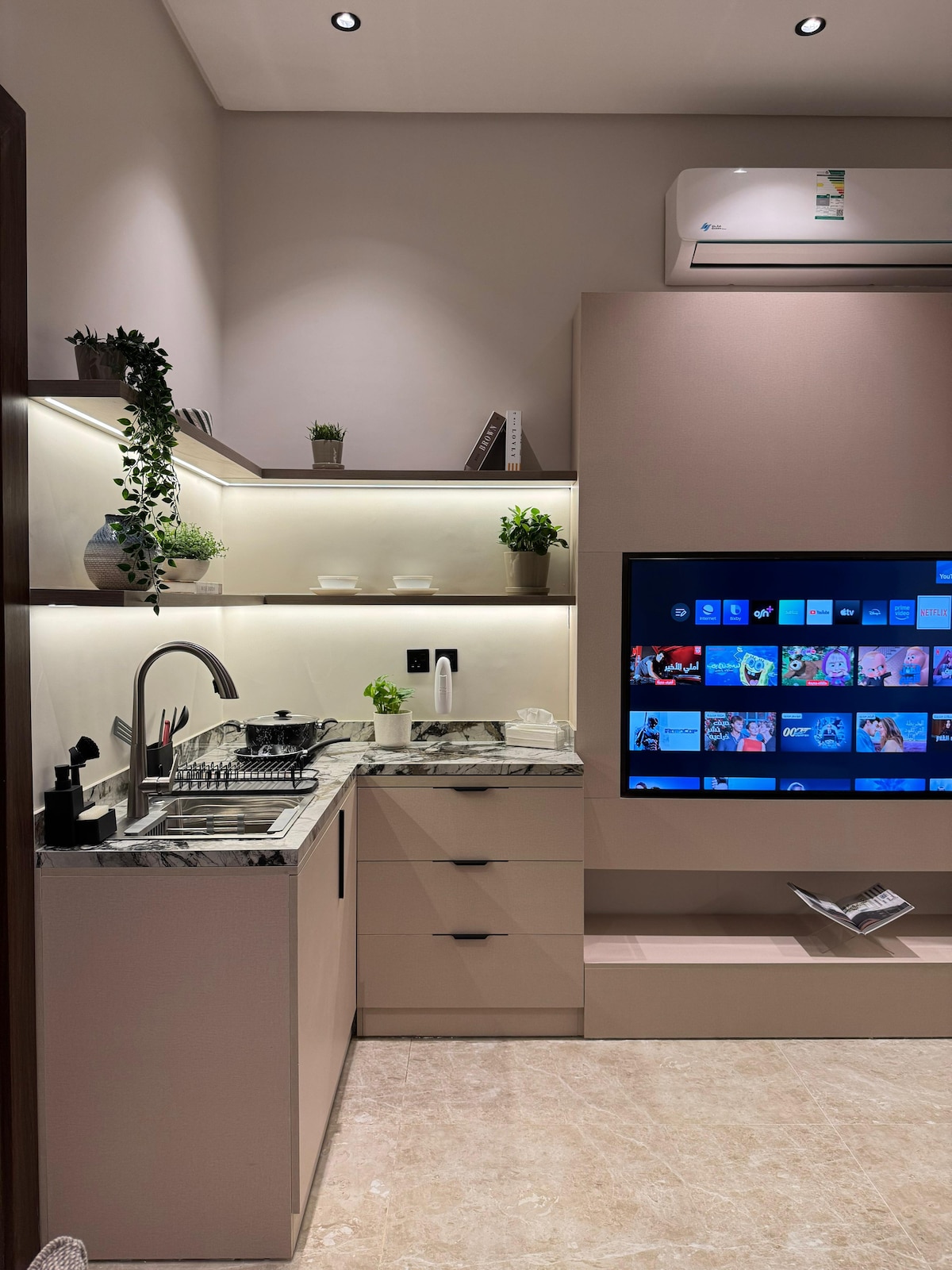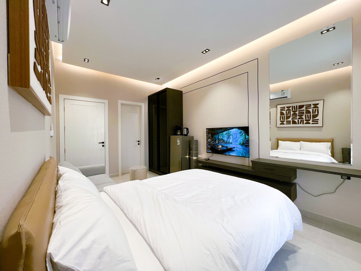 Un estudio elegante y tranquilo ubicado en la planta baja con acceso inteligente para mayor comodidad y seguridad. Tiene una cómoda cama principal y un sofá que es perfecto para relajarse. Equipado con una pantalla inteligente de 60 pulgadas con suscripciones a Netflix, Watch y YouTube Premium para una experiencia de entretenimiento completa. Hay conexión Wi-Fi rápida disponible, con una atención muy alta a la higiene para garantizar una estadía cómoda y perfecta.
