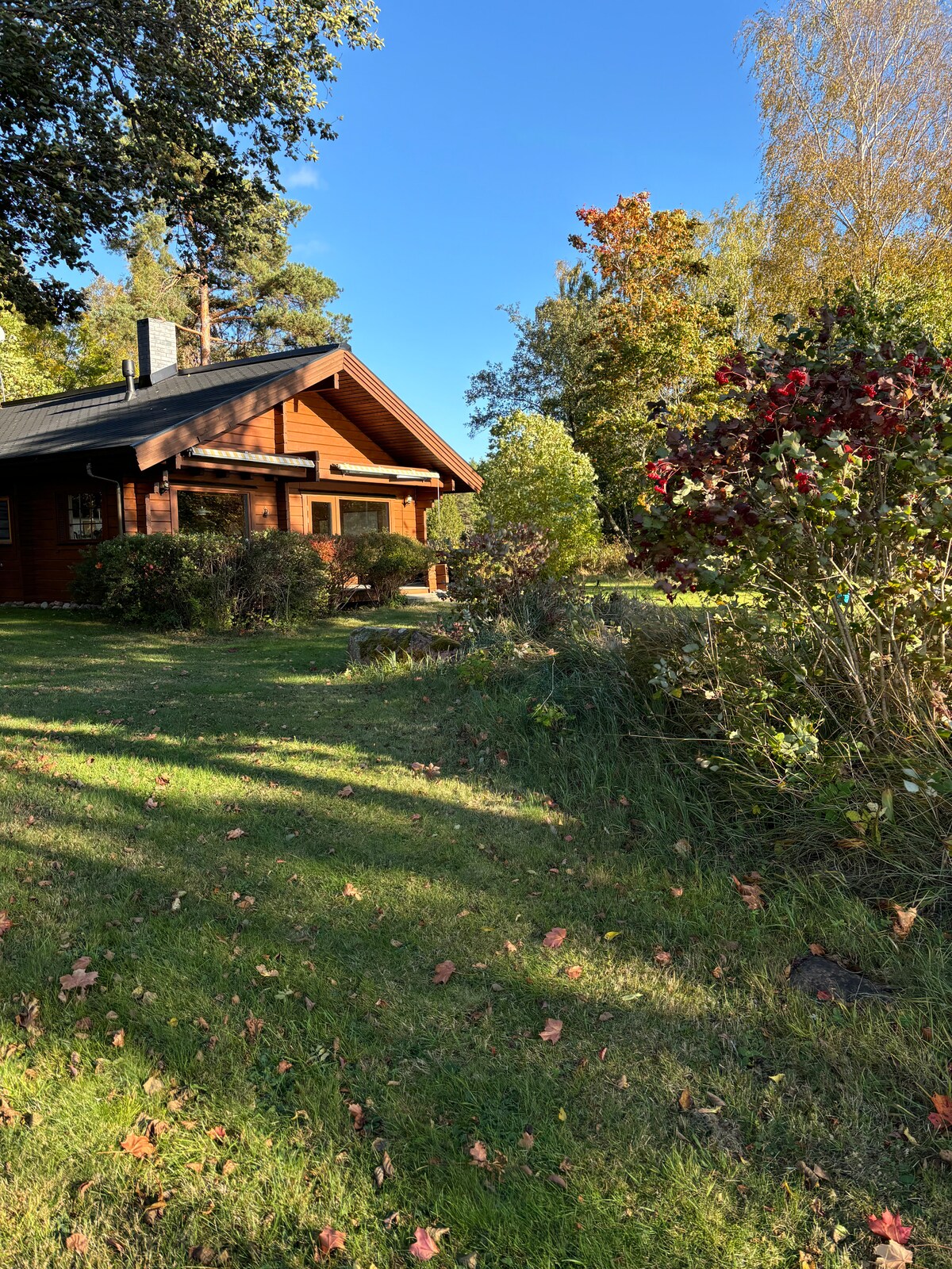 Lleva a toda la familia o amigos a este increíble lugar con mucho espacio para divertirte. Un montón de actividades cercanas, boulder, deportes acuáticos, disc golf y golf real. La casa en 2 pisos es muy generosa con 8 camas, una de las cuales es una cama doble dividida en 3 dormitorios en el piso superior. Arriba también hay un baño con inodoro, así como una puerta al balcón. La planta baja es aún más espaciosa con una gran mesa de comedor con capacidad para 10 personas. Cocina totalmente equipada, así como una lavadora y secadora.