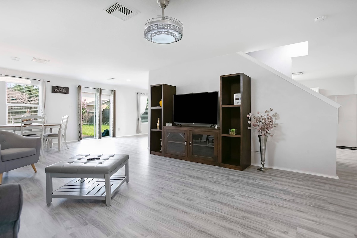 Convenient and easy access to Interstate 45, 14 minutes drive to George Bush Airport (IAH), and about 17 minutes drive to The Woodlands, and Downtown Houston. Modern style home with smart gadgets and home theatre with ceiling speakers throughout the living room and kitchen. Enjoy from our amenities: Coffee Bar, Dedicated Workspace, Vanity Desk, Gas Grill, Surround System, Electric Fireplace, and Cozy Backyard.