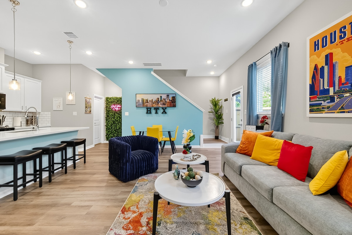 Experience vibrant city vibes at this modern 3BR Houston home! Designed with bold, City-themed décor, this stylish retreat features an open-concept layout, Smart TVs in every room, a fully equipped kitchen, and a relaxing hot tub in a private fenced yard. Enjoy free garage parking, high-speed Wi-Fi. Just 20 mins to Downtown, 25 mins to the Galleria, and 15 mins to IAH Airport. Government ID verification required for check-in.