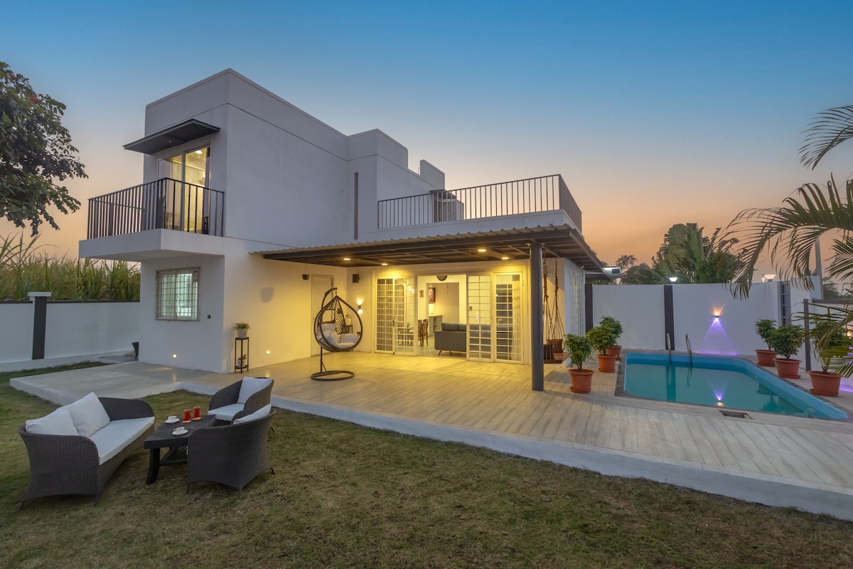 ¿Buscas un alojamiento tranquilo cerca de Bhimashankar y Shivneri? ¡Reserva Vrundavan Villa Manchar, Pune! 🏊 Impresionante piscina privada con características de danza de la lluvia Sistema de sonido 🎵 Sony con Bluetooth 🐶 Se admiten mascotas ¡🛌 3 cómodas habitaciones con baños! WiFi 🛜 de alta velocidad TV Android de 📺 61 pulgadas de alta definición Cenas 🍽️ al aire libre y asientos junto a la piscina 🚘 Estacionamiento gratuito para 5-6 autos Propiedad de 🏡 6000 pies cuadrados con villa de 2750 pies cuadrados Cuidador 👨💼 presencial Vistas 🏞️ panorámicas a la montaña y el paraíso del jardín ¡Ponte en contacto con el anfitrión para reservar la propiedad!