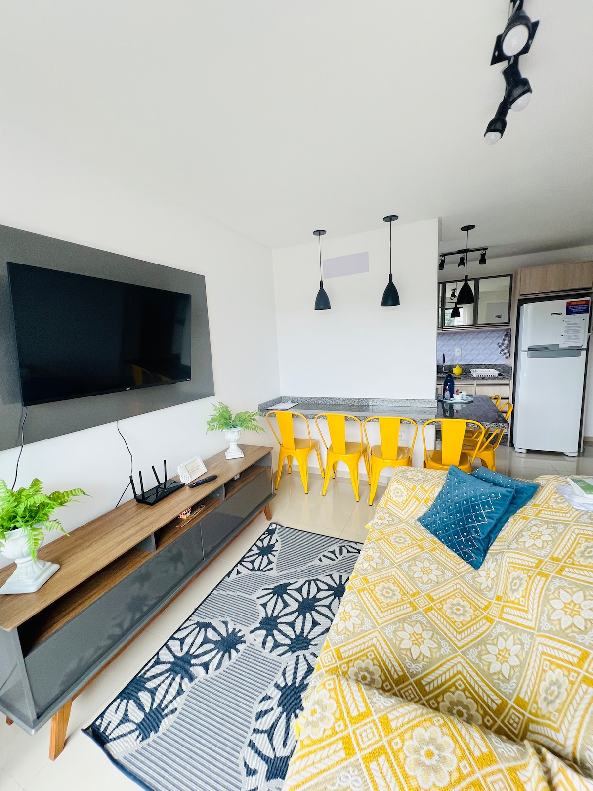 Lindo apto finamente mobiliado, totalmente climatizado. Possui 75m² com varanda fechada e vista lateral mar. Suíte com cama queen mais um dormitório com cama de casal, ambos com Smart TV. Cozinha, sala e sacada com churrasqueira integrados em conceito aberto. A cozinha é equipada com móveis planejados, fogão, forno elétrico, geladeira e microondas, além dos demais utensílios. Lavanderia com lavadora e secadora à disposição.