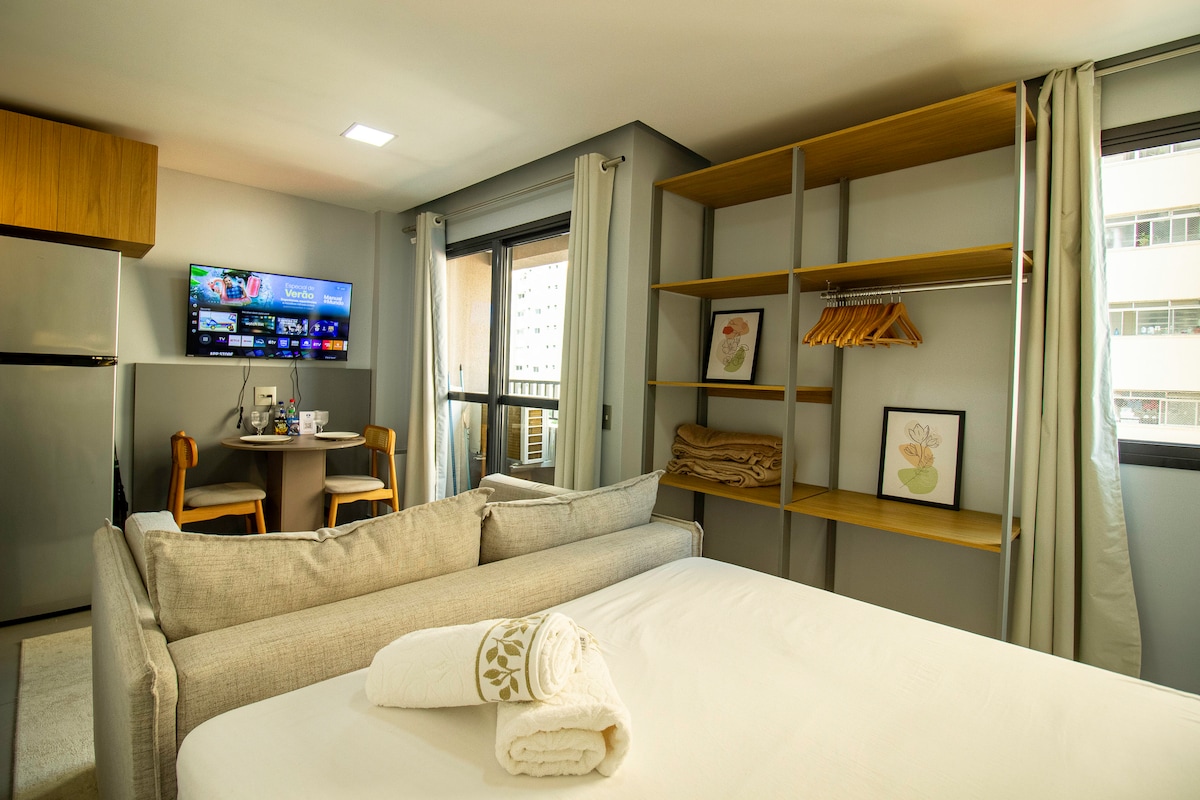Studio 40011: 4 min do Allianz Parque. Estúdio compacto, moderno e completo e confortável em uma das regiões mais culturais de SP. 📍 Cercado por cafés, restaurantes e shows. Aqui a cidade pulsa ✨ Cama aconchegante, bancada, armário, ar-condicionado, TV, e cozinha equipada com sanduicheira, air fryer, cafeteira, fogão, geladeira. 🚿 Banheiro privativo e iluminação acolhedora. com aquele clima de "quero ficar mais um pouco" Perfeito para curtir, descansar ou trabalhar. Reserve agora!