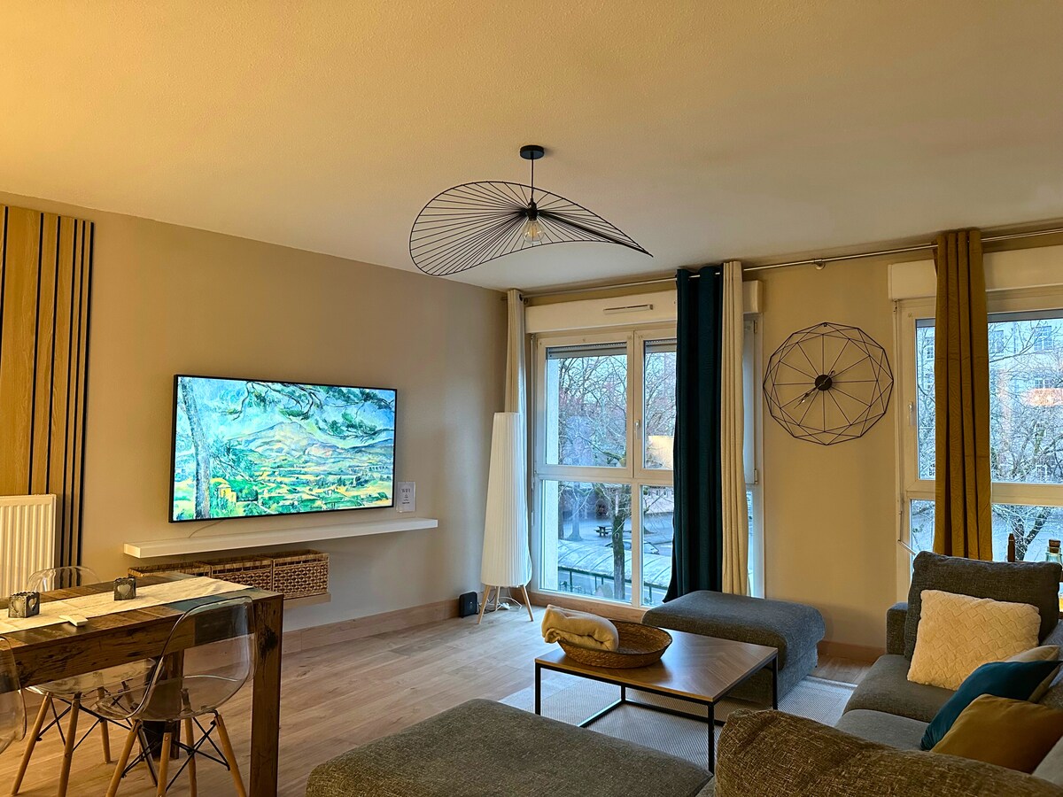 Appartement de 85m2 avec en plus un espace détente SPA, Sauna, écran cinéma de 55m2 privatisé et une grande terrasse situé dans un quartier résidentiel, au calme. Ce logement très chaleureux et lumineux est situé dans un environnement serein, dotée d’une décoration soignée, moderne et toute équipée avec de beaux volumes afin de vous proposer un espace agréable, convivial et propice à la détente. l'espace de vie (cuisine, salon, salle à manger) est très fonctionnel et entièrement équipé.