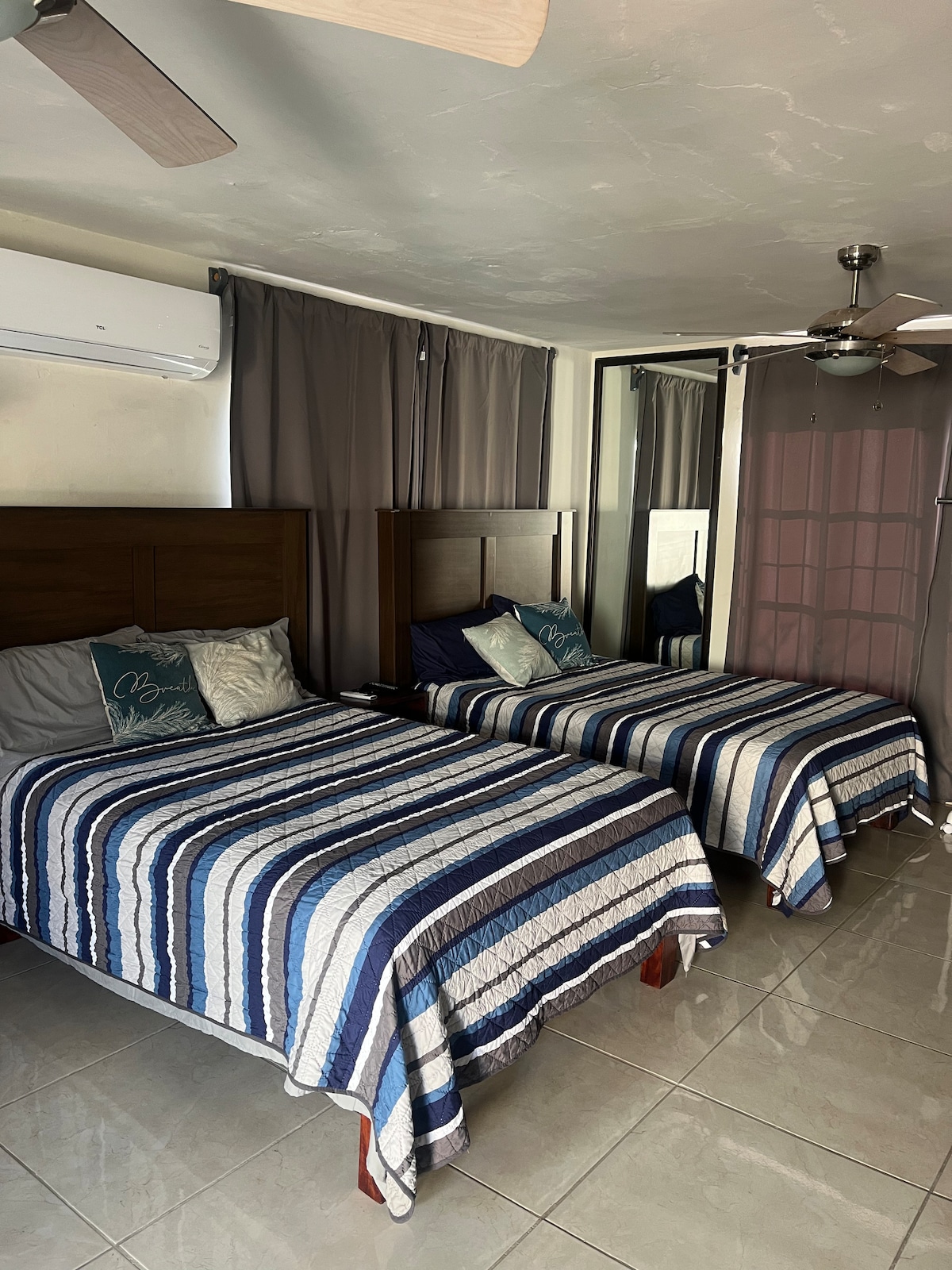 "Nuestro departamento esta a 5 minutos en carro de playa Miramar. Cuenta con cocina equipada con estufa, horno, licuadora, cafetera, utensilios básicos de cocina; Un baño completo con agua caliente. La habitación principal cuenta con MiniSplit, 1 camas matrimonial y una Queen sice y closet amplio. Otra habitación con una cama Quin Size (sin aire acondicionado) . Sala de estar con una pantalla de 40 pulgadas, WIFI, y tv por cable. terraza con asador, mesas y sillas.