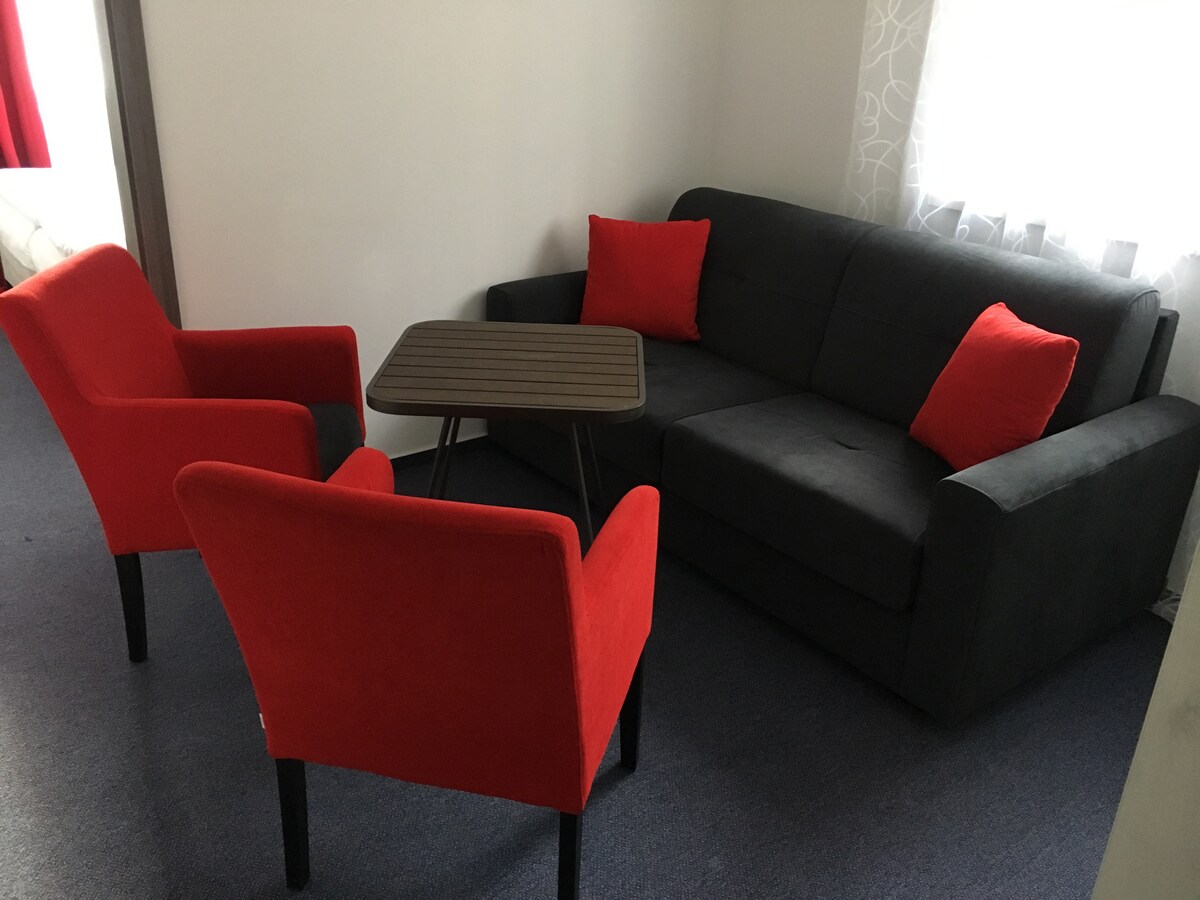 Te ofrecemos una hermosa habitación con cama doble con cerradura de seguridad. El proyecto ha sido recientemente renovado y amueblado. Tu habitación incluye una cama de hotel tamaño queen, armario, mesa de trabajo, sillas, sillones, TV de pantalla plana, toallas, productos de cuidado y pantuflas. ¡El baño está justo al lado de la puerta de la habitación y solo se comparte con otra habitación si solo está ocupada! Una cocina con hervidor de agua y horno microondas está a tu disposición. Parque y wifi.