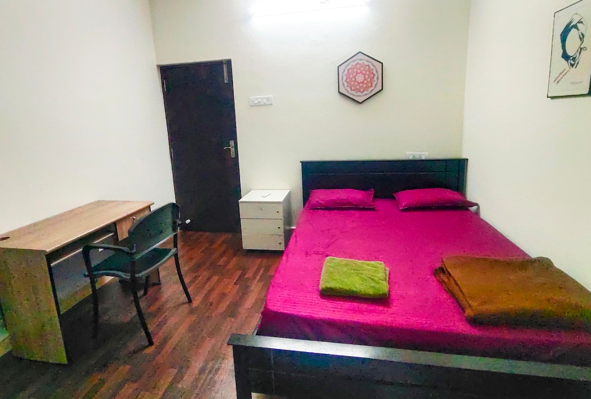 Situated on the third floor of an old residential building, the space features a furnished en-suite bedroom and balcony, and a dining room. No kitchen or cooking appliances, but there is a refrigerator, microwave and kettle. 25-30 minutes to the airport and railway station. 8 minute walk from Nandanam Metro Station. It is ideal for travellers seeking comfort and connectivity. It is accessible via elevator, and it has a shared entrance with a small office (please see the layout photo).