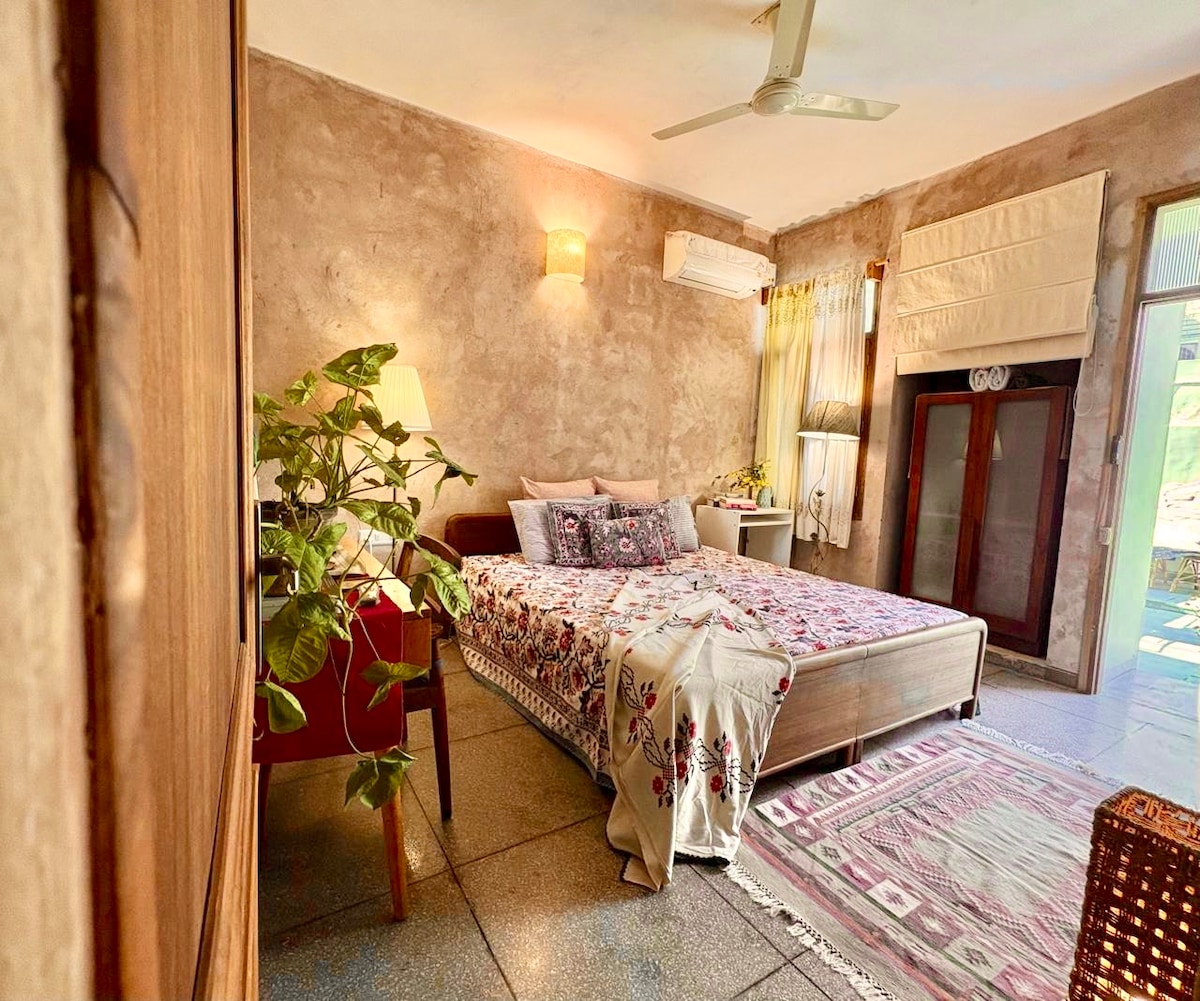 Step into a space where earthy charm meets modern comfort. Nestled in a peaceful, family-friendly gated neighborhood, Studio Sienna is a cozy 2BHK apartment designed for slow living, creative vibes, and warm hospitality. Located on the 2nd floor, the apartment is drenched in natural light and styled with a warm terracotta palette, the interiors are filled with handcrafted decor, rustic wooden textures, vintage finds, and original artworks thoughtfully chosen to make you feel instantly at home.