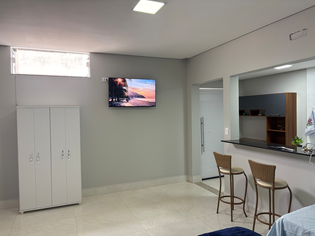 Relájate en este espacio tranquilo y elegante. y acogedor sofá cama para niños aire acondicionado Televisor inteligente Android de 32 pulgadas wifi secador de cabello frigobar caja de cama Todo nuevo hecho con gran cariño. Tiene artículos de cocina de preparación rápida vendidos la parte kitnet ubicado a solo 1 km de la autopista Anhanguera bakery cercano mercado cercano cerca de la farmacia ATENCIÓN: NO FUMAR DENTRO DEL KITNET. Nota: El garaje no se adapta a una camioneta.