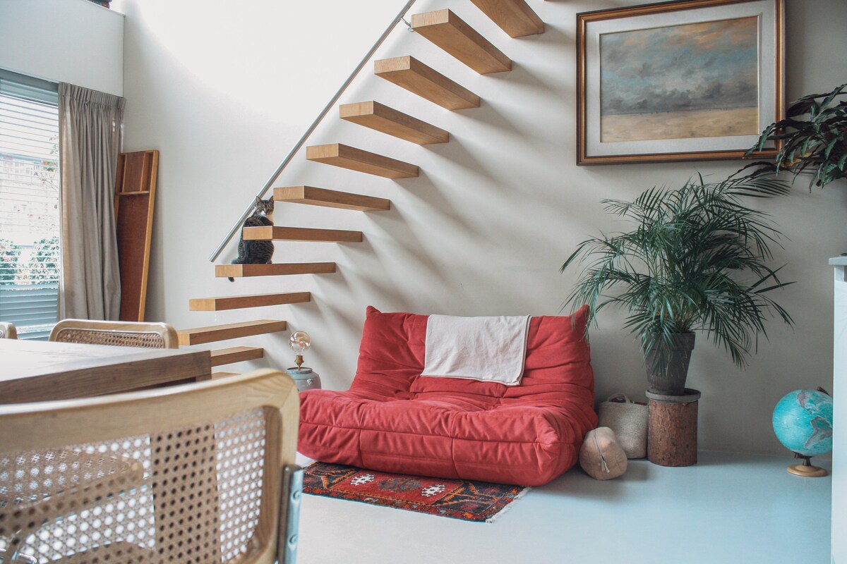 Stylish, unique and quiet apartment (74m2) with roof terrace + fireplace with a lot of natural daylight close to Vondelpark! Unique opportunity to experience the best Amsterdam has to offer such as Vondelpark, Oud West and South area, and many restaurants and bars around the corner. Just next to tram stop line 1 and supermarket. On the 4th floor (without an elevator) and no noise from neighbors because of the top floor. Access to a unique roof terrace where you can watch the sunrise to sunset!