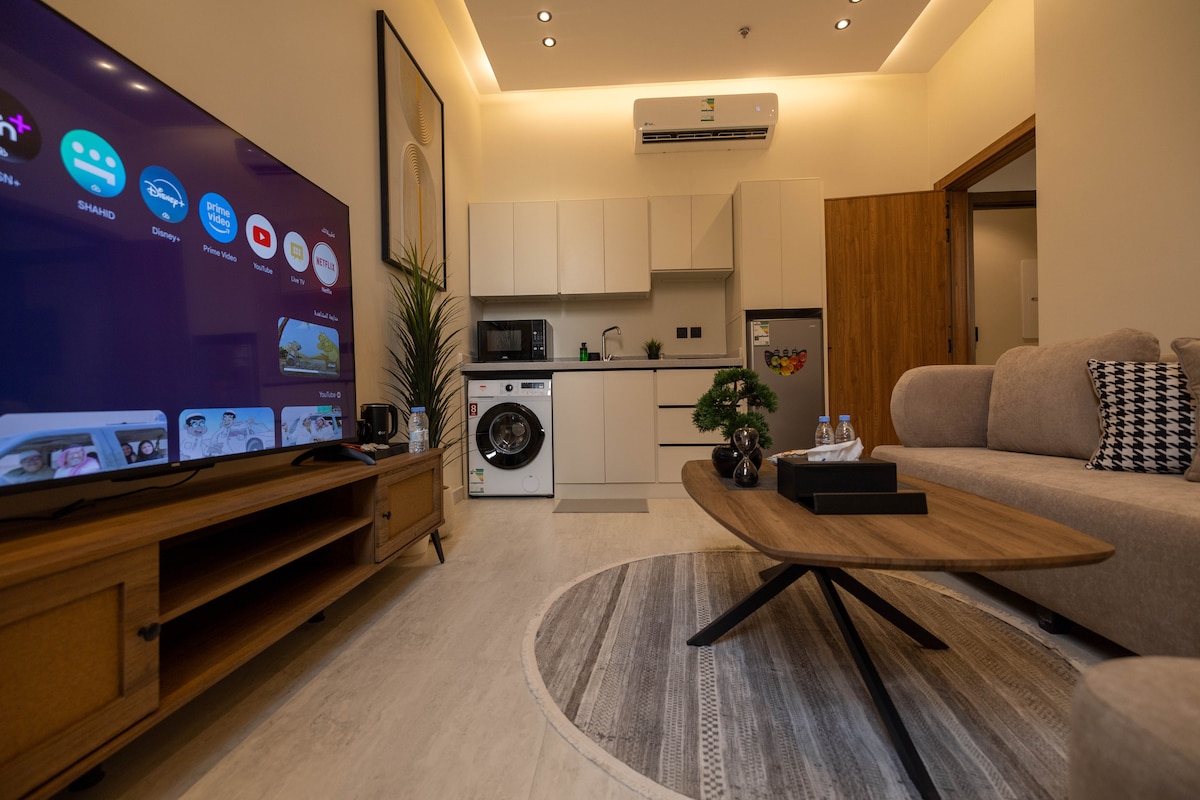 Amplio y nuevo estudio hotelero de lujo en una ubicación tranquila y privilegiada. Check-in automático, Wi-Fi, sofá cómodo de alta calidad, rincón de café de lujo, estacionamiento, amenidades hoteleras y cocina totalmente equipada. Ubicación céntrica: a solo 1 km del Anillo Norte, 12 min al aeropuerto, 15 min al Distrito Financiero, 5 min a Nakheel Mall, 15–20 min a Riyadh Season y Boulevard, y 10–15 min a universidades principales. Limpieza diaria.