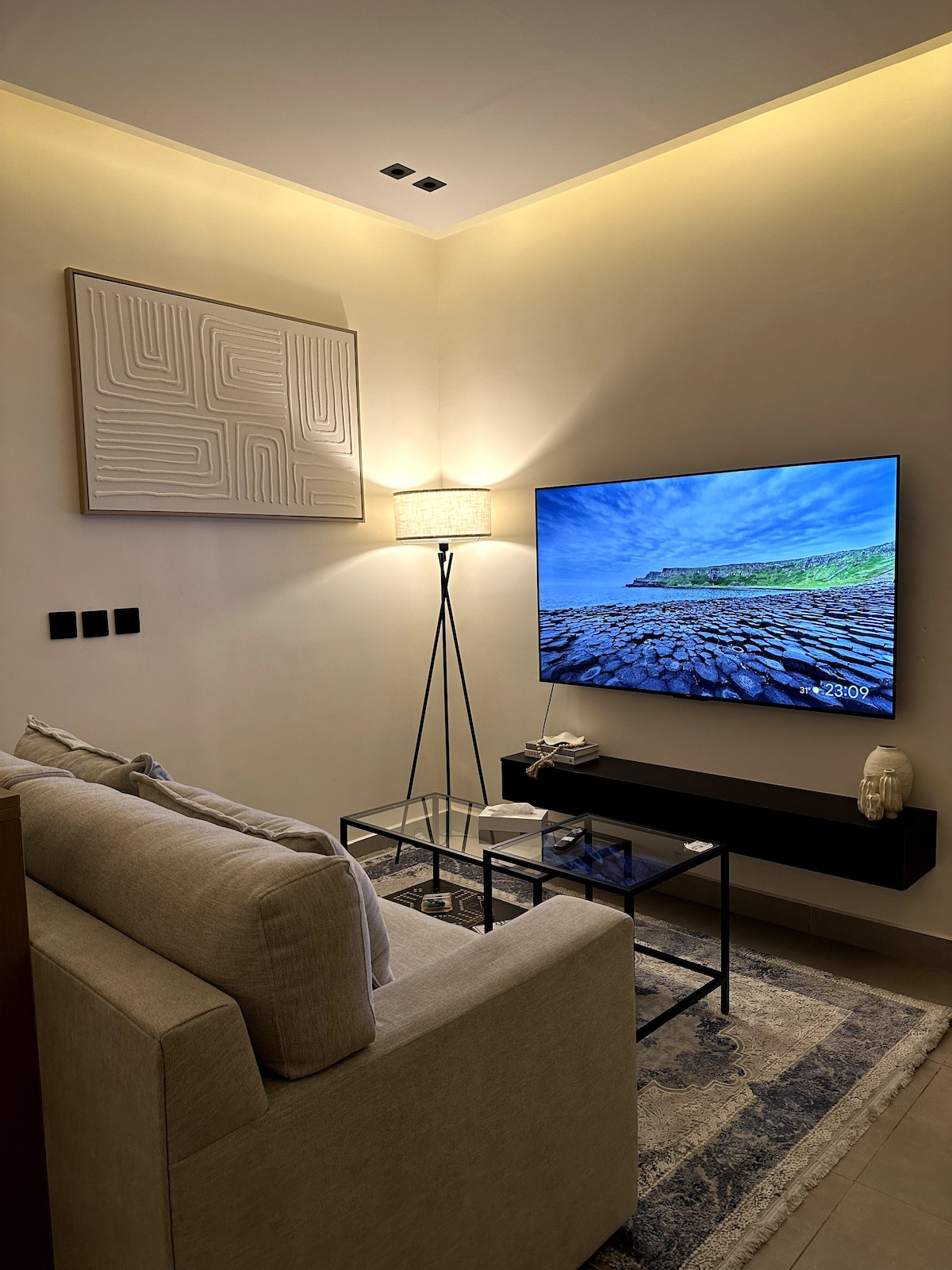 Moderno departamento de hotel de 1 dormitorio en una zona tranquila. Registro de entrada automático, WiFi, colchón médico, sofá premium, rincón de café, comodidades del hotel y cocina completa. • Ubicación privilegiada en el norte de Riad, a 1 km de la carretera de circunvalación norte: • Aeropuerto: 12 minutos. • Centro financiero: 15 minutos. • Parque Riyadh, Nakheel, centro comercial Granada: 10–20 minutos. • Riyadh Season & Boulevard: 15–20 minutos. • Imam, Princesa Noura y e-Universidad: 10–15 minutos. • Nota ⚠️ Limpieza diaria estilo hotel previa solicitud.