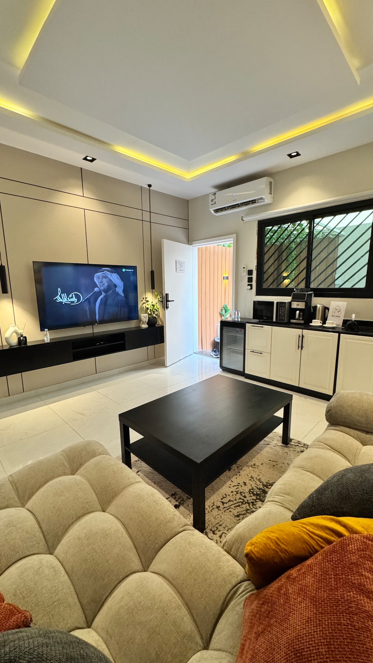 Apartamento de lujo al norte de Riad Diseñado para ser diferente y elegante con un jardín al aire libre, Tiene total privacidad y entrada automática . Ubicación estratégica 📍 Ubicado a una distancia : A 15 minutos en coche de la temporada de Riad.🌟 A 10 minutos del parque Riyadh. 🛍️ A 13 minutos del Centro Financiero King Abdullah. 🏙️ A 18 minutos del aeropuerto internacional King Khalid.🛫 Consta de una habitación americana, salón, cocina y jardín privado al aire libre.