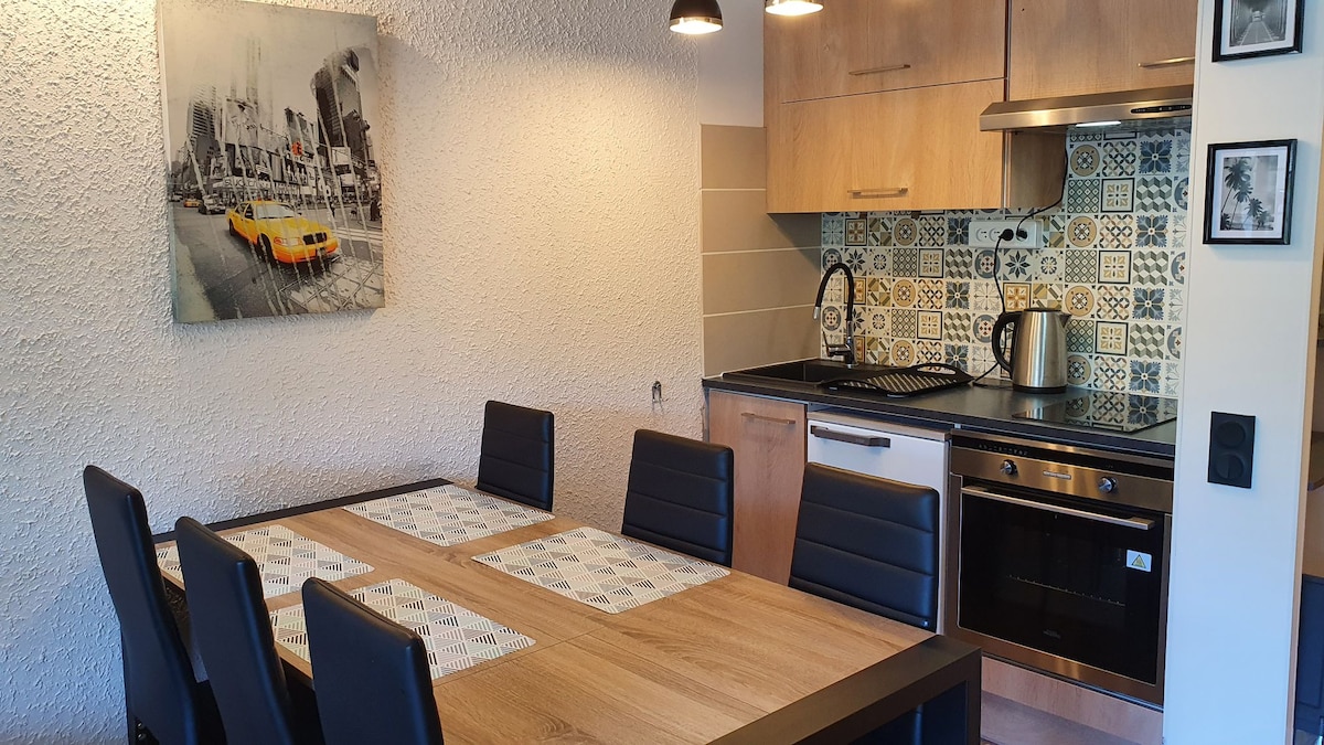 Apartamento nuevo de 50 m2 con muy bonitas vistas del pueblo y el fondo del valle. Ideal para 2 parejas o una familia de 4. 1 dormitorio con cama de 160, baño e inodoro contiguos, 2.º dormitorio en altillo con cama de 140 + baño e inodoro contiguos. Amplia sala de estar con cocina hiper equipada. Local para esquís. Con una ubicación ideal al pie de las pistas frente al telesilla de Chategré, todas las tiendas y restaurantes del pueblo están a poca distancia. Apartamento tranquilo en la 2.ª y última planta con ascensor.