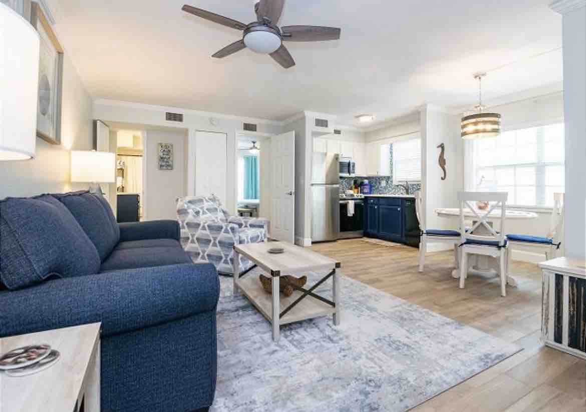 POR FAVOR, TEN EN CUENTA QUE HAY VARIAS UNIDADES EN CONSTRUCCIÓN en el edificio. Se espera que esté terminado para el 31 de mayo. Increíble departamento frente a la playa, recientemente remodelado en el segundo piso. Suelo de tabla de vinilo en todas partes, sin ALFOMBRA. 2 dormitorios, 2 baños. Vistas completamente despejadas de la playa. Tiene una ubicación céntrica, a menos de 1 milla del mundialmente famoso Johns Pass. Disfruta de impresionantes puestas de sol desde tu sala de estar con el agua a pocos metros de distancia. El condominio está a poca distancia a pie de tiendas, bancos y muchos restaurantes y bares.