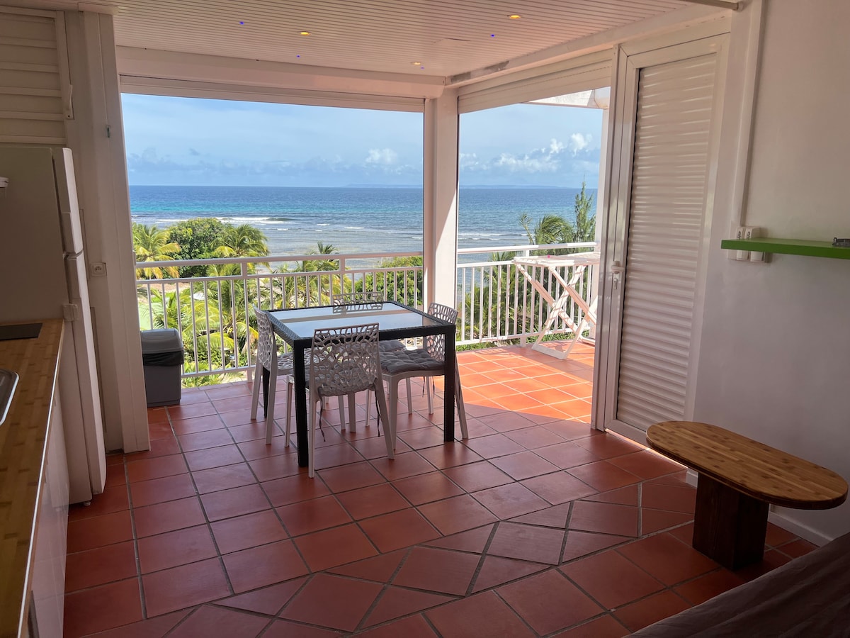 Studio d'exception pleine vue mer et plage juste en dessous. Pour 2 personnes ( + lit parapluie possible ), situé dans un parc tropical avec plage privée bordée d'un lagon, tennis, piscine à débordement, restaurant ... Cuisine équipée, linge de maison fourni, citerne tampon de 3000 litres,en cas de coupure d'eau. Photos contractuelles du logement et des environs immédiats ( 200 mètres)