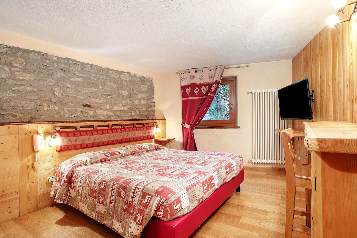 Acogedora y luminosa, la Habitación Capriolo es perfecta para parejas o viajeros que buscáis tranquilidad. Con 15 m², tiene capacidad para 2 personas y ofrece bonitas vistas a las montañas. Cuenta con dormitorio, baño privado, Wi-Fi y TV. Cuna y trona disponibles bajo petición. Podéis relajaros en el jardín compartido y disfrutar de la naturaleza. La habitación no dispone de aire acondicionado, ideal para una estancia sencilla y auténtica.