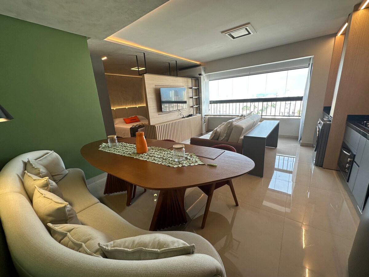 Nuevo apartamento de 1 dormitorio con diseño acogedor, uno de los mejores vecindarios ubicados en la ciudad de Goiânia: Vila Alto da Glória. - Dormitorio con cama tamaño queen, aire acondicionado y televisor de 40 pulgadas. - Espaco home office - Sala de estar con sofá, aire acondicionado, TV de 50 pulgadas con Netflix. - Cocina equipada. - Internet de alta velocidad. - Enxoval completo. - Carretera de garaje Proximidades: - Centro comercial Flamboyant, a 3 minutos en coche. - Arena Multiplace: 1 min en auto. - Unip/Fasam - 2 min. en auto. - Oscar Niemeyer - 3 min. en auto.