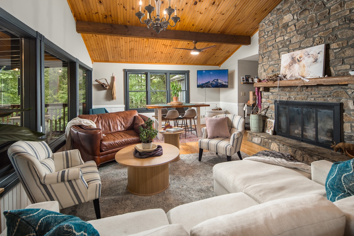 ¡Relájate y disfruta del acogedor, cómodo y elegante chalet, a pocos minutos de Blue Ridge Parkway y la estación de esquí de los Apalaches! Disfruta de una cocina totalmente equipada, una amplia terraza con comedor al aire libre adicional y parrilla Weber, y un área de visualización de TV para niños adicional en la planta superior. Esta excelente ubicación te permite llegar fácilmente a tiendas de comestibles y compras con la franja principal ubicada a solo 4 millas de distancia. Un fácil viaje de 6 millas te lleva al centro de la ciudad de Boone, y Blowing Rock es fácilmente accesible a 3 millas de distancia.