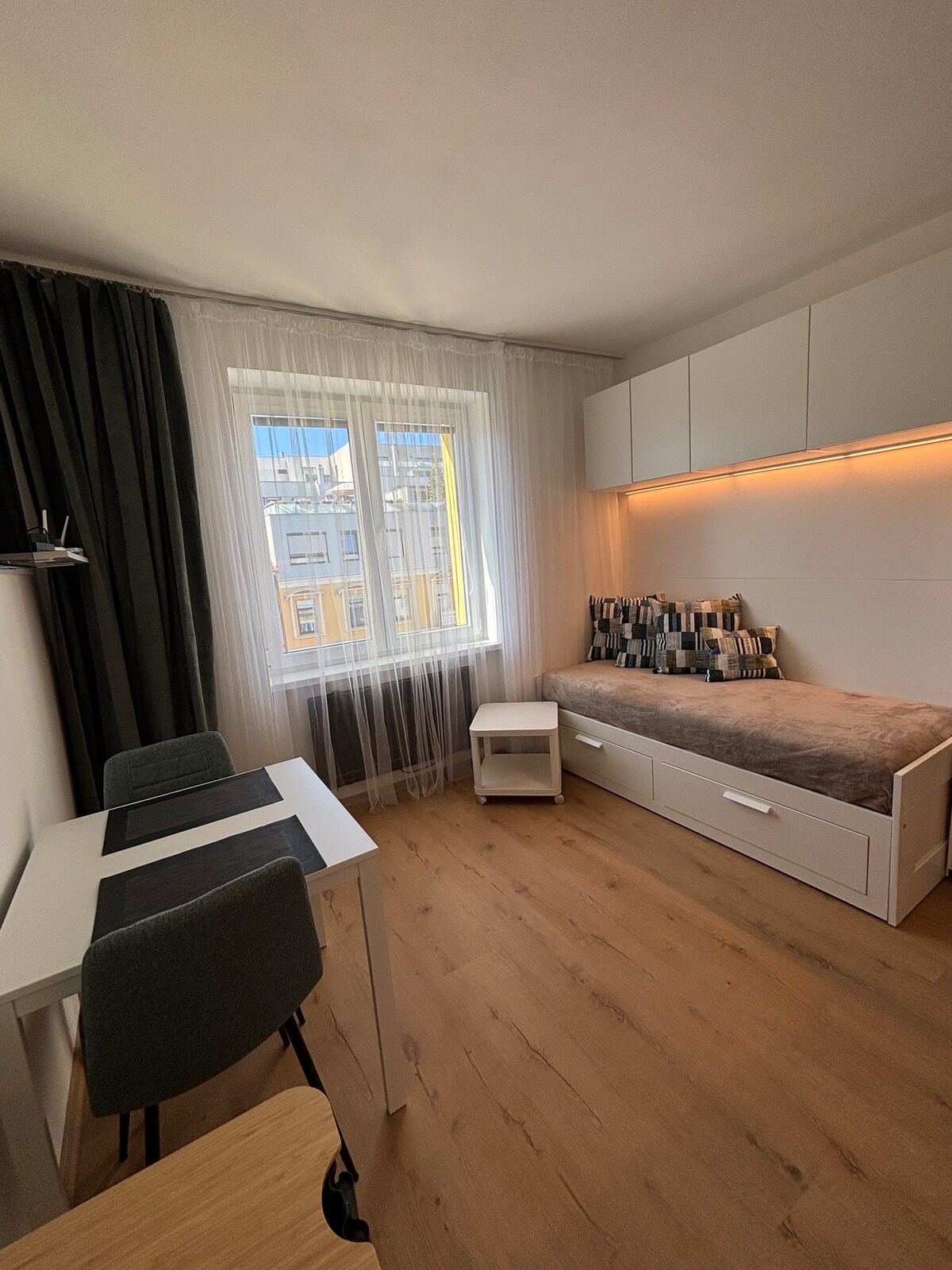 Moderno apartamento de 2 habitaciones (54 m²) en el corazón de Poprad. Amplia sala de estar con sofá cama y TV de pantalla plana con SkyShowtime, cocina totalmente equipada, acogedor dormitorio con mucho espacio de almacenamiento y acceso al balcón, y moderno baño con bañera. Registro de entrada autónomo para llegada flexible, WiFi gratuito, estacionamiento gratuito disponible. Apartamento tranquilo en una ubicación central. Tiendas, restaurantes y cafés a pocos pasos. Parque acuático Aquacity a 750 m. Estación de tren con acceso a los Altos Tatras a 10 minutos a pie.