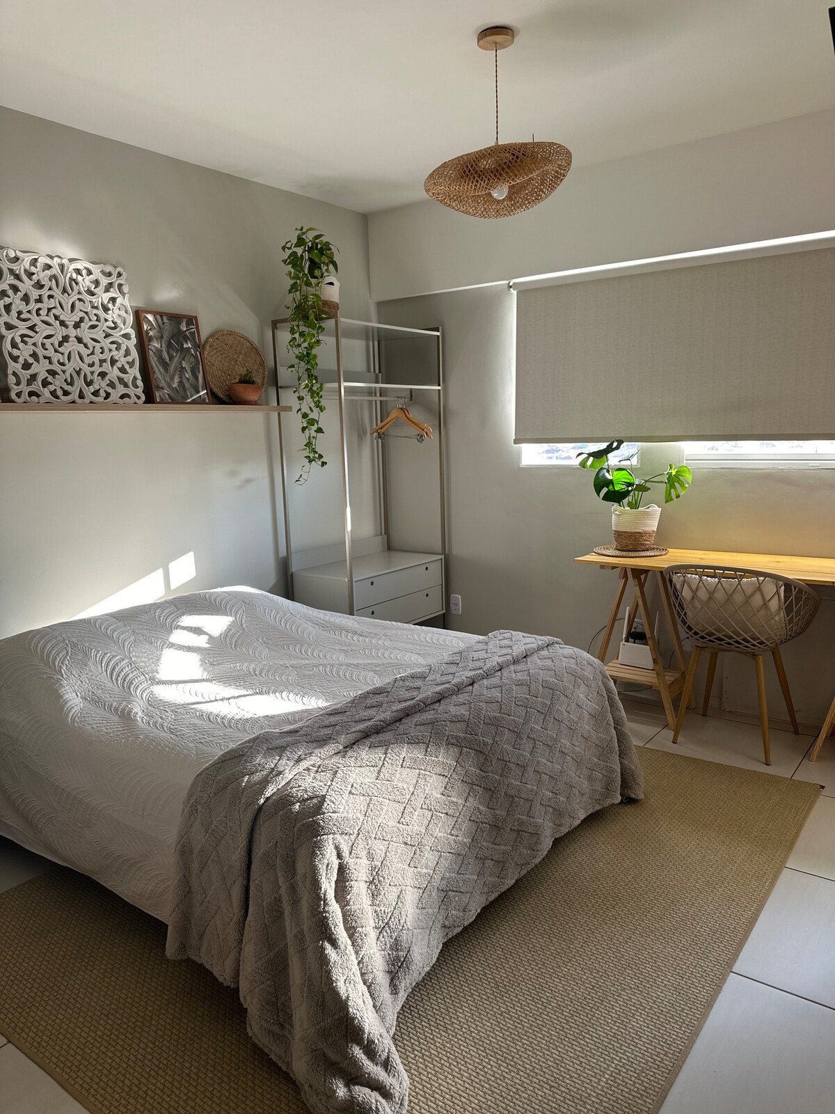 Apartamento completo, con capacidad para 2 personas. Cuenta con un dormitorio con cama queen, aire acondicionado, espacio de oficina en casa, armario. Baño privado, cocina completa. TV por cable en la sala y wifi incluido. Condominio con conserjería las 24 horas, piscina, gimnasio y lavandería para uso gratuito. Una plaza de garaje cubierta incluida. Ubicación cerca del centro, supermercado, farmacia y restaurantes. Toallas, ropa de cama, mantas y almohadas estarán disponibles. Barrio tranquilo.