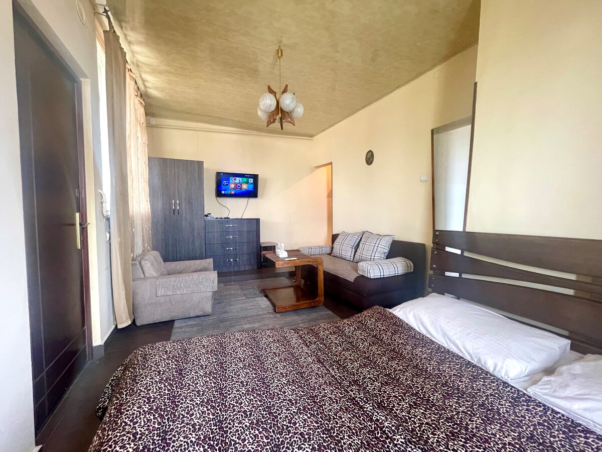 Estudio cómodo con todo lo necesario para vivir, descansar o trabajar. El estudio está situado cerca del centro de la ciudad, a solo 15 minutos a pie del centro principal de Ereván. Tercer piso de la casa, con una terraza y una vista maravillosa a la ciudad. Aunque es un lugar céntrico, puedes disfrutar de tu tiempo en el jardín verde y oler el aire fresco, porque la casa está situada en medio de muchos jardines. Planificamos el estudio y lo equipamos con todo lo que los huéspedes podrían necesitar.