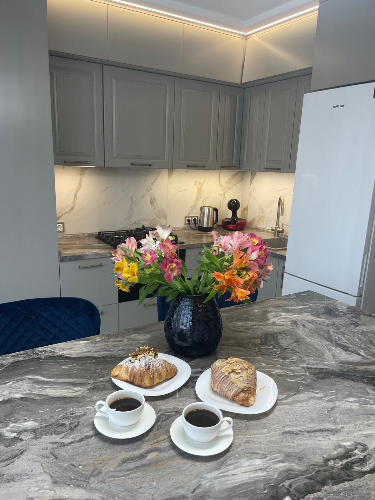 En este amplio lugar, toda la casa está diseñada para una estadía cómoda. Se ubica en un edificio nuevo con interiores modernos, Wi-Fi rápido, aire acondicionado y recirculador, baño con secador de pelo, lavadora y secador de toallas eléctrico. En este espacioso lugar, toda tu familia podrá pasar un buen rato. La casa tiene dos televisores grandes de 43 pulgadas, una campana, un horno y un microondas, una lavadora, un juego de té, un juego completo de platos, una nevera, batas de baño, aire acondicionado.