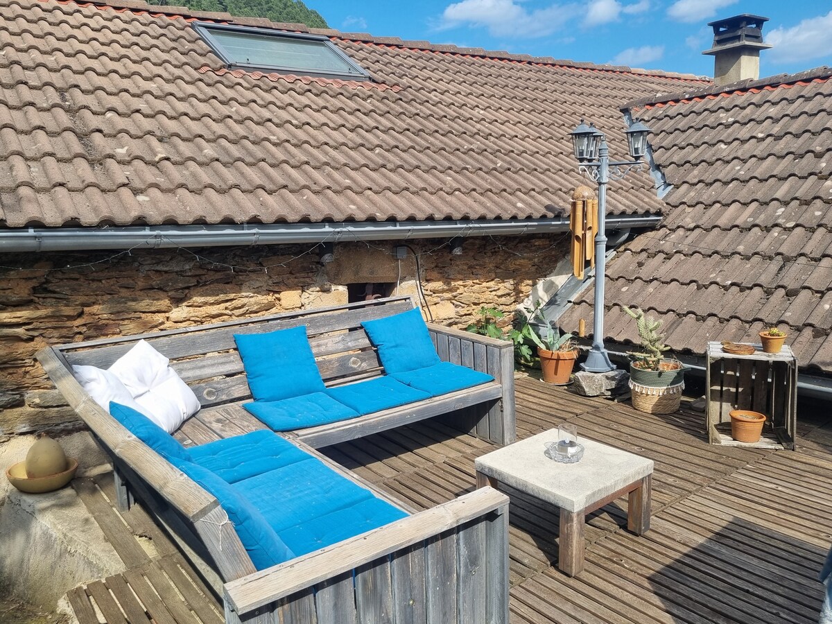 Casa de piedra, totalmente renovada, tranquila. IDEAL PARA PAREJAS Planta baja: sala de estar/ comedor/ cocina totalmente equipada (placa , horno, nevera, vajilla y equipo de cocina), sofá cama (cama adicional en 140) Pequeña televisión. Cuarto de baño con ducha a ras de suelo, dos lavabos, inodoro separado, PISO: un dormitorio cerrado con una cama de matrimonio de 160 . Terraza exterior independiente contigua a la casa así como una entrada privada. Posibilidad de alquiler de larga duración