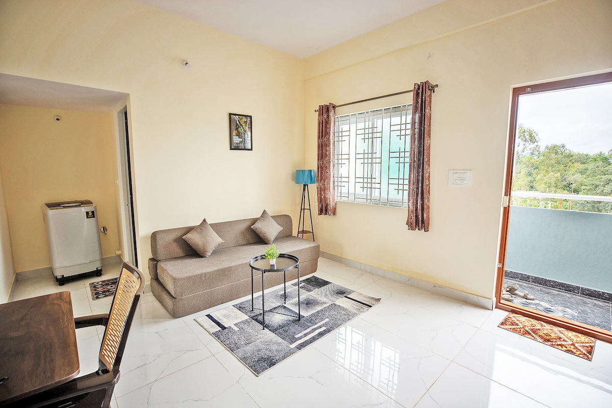 Cozy 1BHK w/ Balcony, Workspace & Green Views | Bannerghatta Road | walking distance from IIM Bangalore, South Gate Welcome to your home away from home in the heart of South Bengaluru! This thoughtfully designed mini 1BHK apartment (325 sq feet approx) in Happy Square, Bannerghatta Road, is perfect for solo travelers, couples, or remote workers looking for a peaceful, well-equipped stay. Guests can book the place for romantic date night or private birthday party celebration for small group of 4