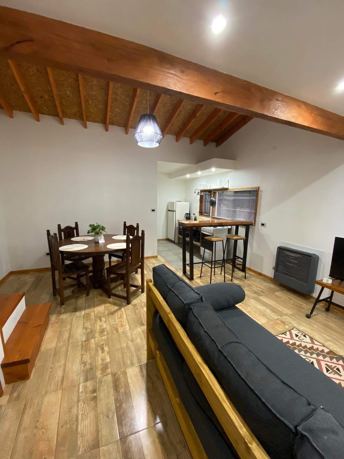 Amplio y luminoso bungalow de 2 ambientes, ideal para parejas, cómodo y acogedor, con excelente ubicación, a pocos metros de centros comerciales, transporte público y a pasos del teleférico Cerro Otto. Cuenta con señal de Wifi, cocina completa equipada con cafetera, pava eléctrica, microondas y heladera con freezer, baño completo con bañadera, espacioso dormitorio con sommier de 2 plazas, smart TV, estacionamiento y jardín para disfrutar, en un espacio tranquilo y familiar.