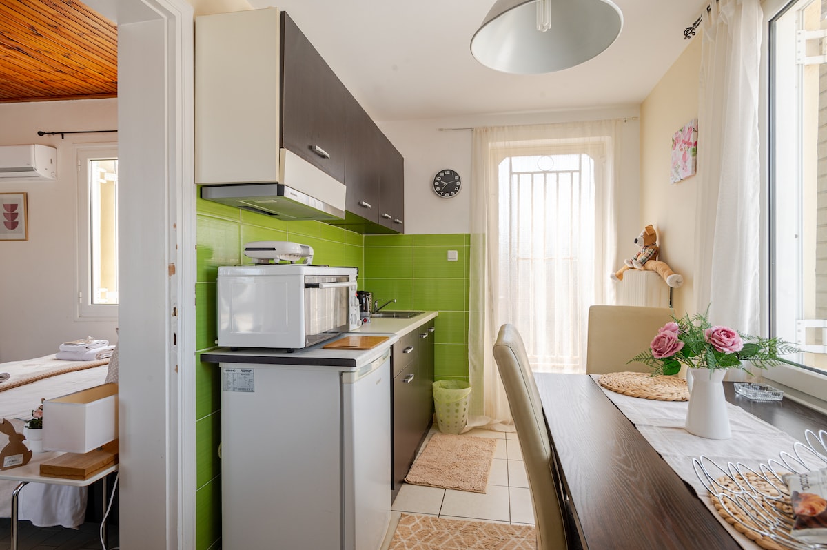 ¡Te damos la bienvenida a Kalamata! La casa está a solo 15 minutos del centro de Kalamata y a solo 5 minutos del aeropuerto. Tiene una terraza enorme, admite mascotas y es acogedora. Es perfecta para parejas o una sola persona. ¡Wifi y nueva cama doble añadidos! Está amueblada, es moderna, está recién pintada y tiene unas vistas estupendas a la ladera de la montaña. Obtienes: ¡Una cálida bienvenida! Cafetera, estufa, nevera y wifi Toallas limpias, sábanas y artículos básicos de higiene. Privacidad Silencioso Entorno apto para mascotas aire acondicionado