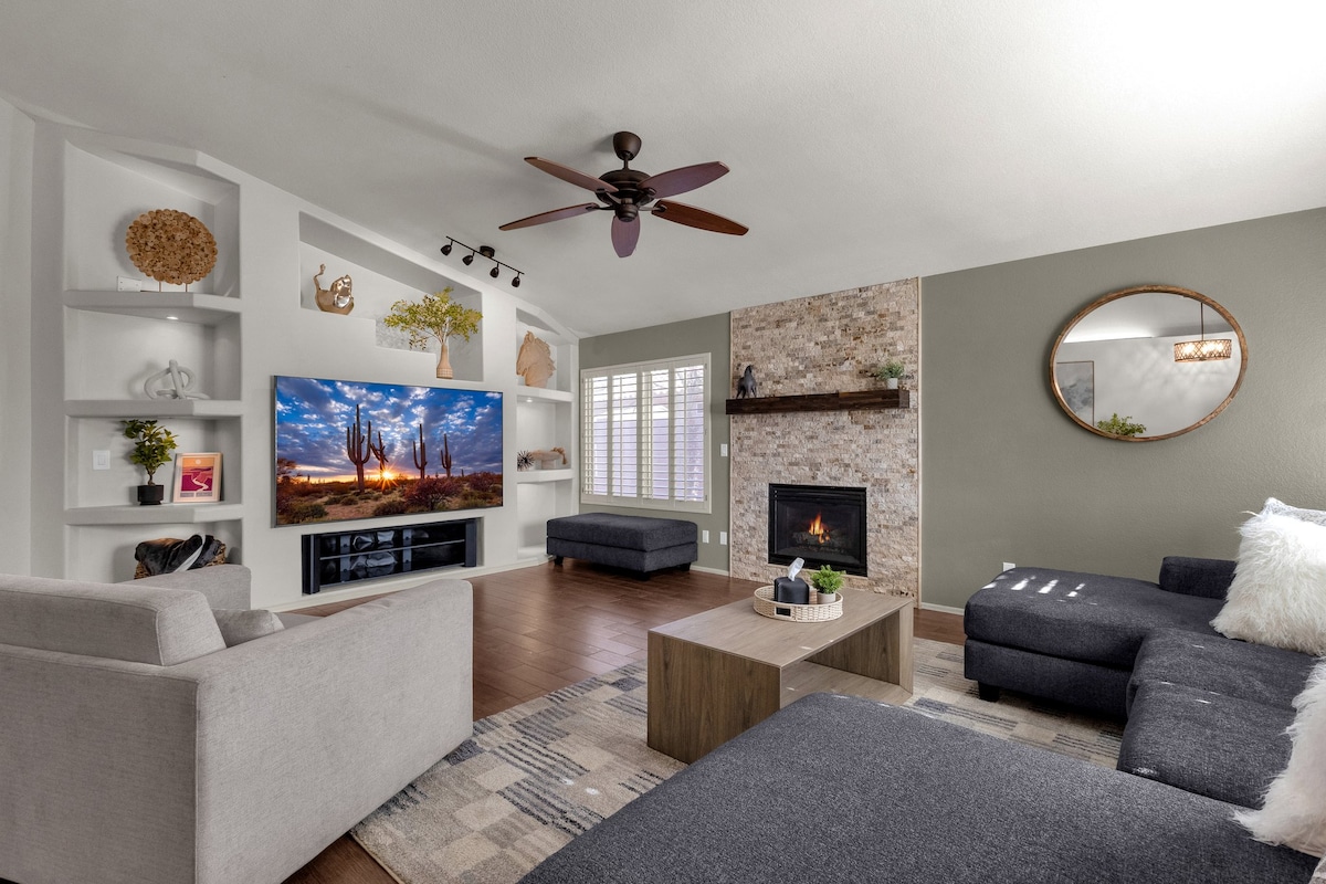 Maravilloso, cómodo, espacioso, más de 2300 pies cuadrados. Casa unifamiliar totalmente amueblada. ¡Mucho espacio para pasear con sala de estar y sala familiar con chimenea de gas! Disfruta del sol de Arizona o de las hermosas noches estrelladas en este patio trasero privado estilo resort. con patio cubierto, piscina de juegos y mesa de fuego de gas. También incluye patio vallado para tus mascotas. ¡Se admiten mascotas! 1 estacionamiento en garaje. ¡Gran barrio! Cerca de excelentes restaurantes y tiendas y acceso a la autopista. AZ TPT#21500053