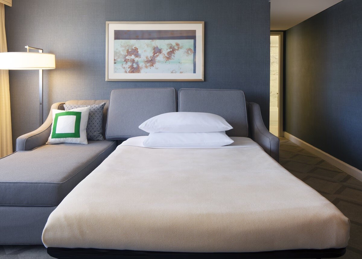 Estas espaciosas suites renovadas y mejoradas con una cama tamaño king y 1,5 baños ofrecen un amplio espacio habitable en los pisos superiores mejorados de este rascacielos urbano. Las salas de estar tienen muebles elegantes, mejorados y contemporáneos que incluyen un sofá, una silla cómoda y un comedor. Dos televisores de pantalla plana y cable digital premium con HBO.