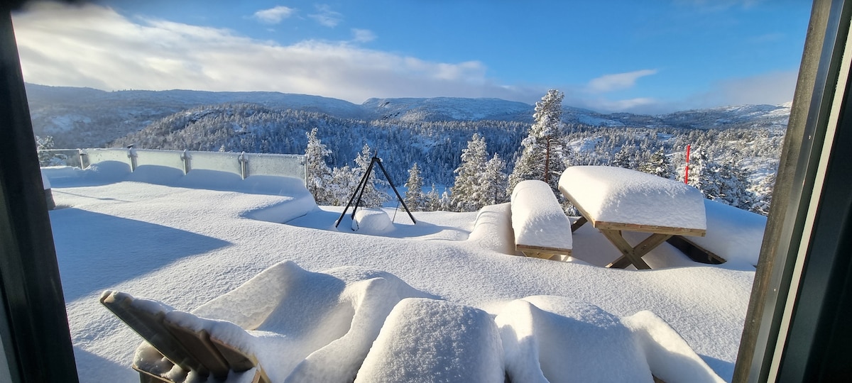 La cabaña es nueva en otoño de 2022, con grandes ventanales que atraen la naturaleza a la cabaña. Terrazas en todos los lados de la cabaña para disfrutar del sol desde la madrugada hasta la tarde. Adecuado para 2 familias o grupos de amigos adultos. Apto para niños. Grandes paseos a partir de la cabaña. Bortelid puede ofrecer experiencias en la naturaleza en senderos marcados, picos, montañismo, senderos en bicicleta, pesca de truchas de montaña, alquiler de kayak, cancha de frisbee. 18 cestas. Minigolf. Baño en el agua. Tienda de comestibles.