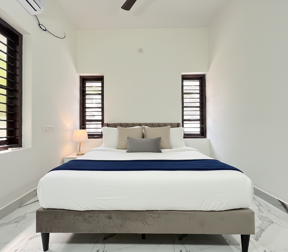 La casa tiene dos habitaciones dobles con aire acondicionado y baños adjuntos; una con calentador de agua y un baño común. Colchón doble adicional disponible en una habitación con cama. El espacioso pasillo tiene una mesa de comedor con 6 sillas, sofá y un diwan. La cocina con área de trabajo tiene nevera, purificador de agua, instalaciones de cocina, etc. El pasillo que conduce a la habitación Pooja y un patio al lado de un patio central son ideales para relajarse. Todos están bien ventilados con mosquiteros y para uso exclusivo de los huéspedes.