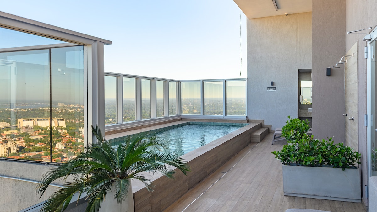 Departamento ubicado en un piso alto, con balcón y vista despejada, totalmente equipado para una estadía cómoda: - Cama king con colchón firme de alta densidad - Espacio de trabajo con escritorio y conexión WiFi - Smart TV de 55'' - Rooftop con piscina y gimnasio - Quincho - Lavandería - Seguridad las 24 horas Ubicación excepcional: - Situado en el Eje Corporativo, a solo 5 minutos del Shopping del Sol y Paseo La Galería - A 15 minutos del Aeropuerto Internacional Silvio Pettirossi