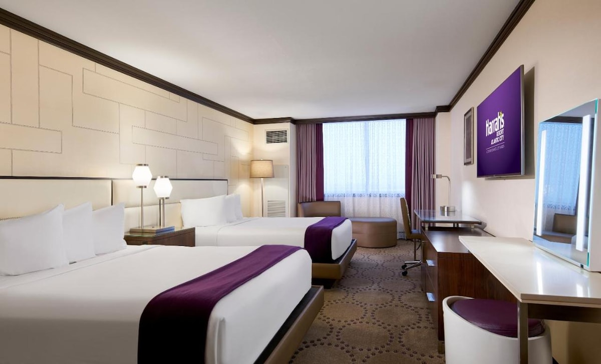Esta habitación doble tiene un piso de baldosas/mármol, zona de estar y TV de pantalla plana, plancha y tabla de planchar, cafetera, estéreo para iPod, caja fuerte y refrigerador. Esta habitación cuenta con una vista de la ciudad o la bahía desde la torre costera. <p><b>Descripción del hotel</b></p>Perfecto para viajeros de negocios y de placer por igual, Harrah 's Resort Atlantic City– A Caesars Rewards Destination te coloca a solo dos millas del paseo marítimo. Con vistas a la bahía brillante, este hotel cuenta con suites espaciosas y contemporáneas con