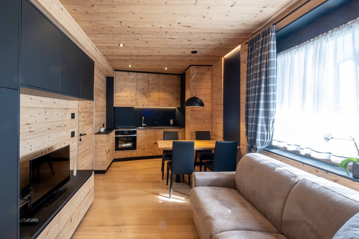 Apartamento con un dormitorio separado con vistas a las montañas o vistas al valle a los Dolomitas. Balcón o terraza con vistas a las montañas o sobre el valle a las dolomitas / sala de estar /TV LED HD/cocina de marca totalmente equipada/ un dormitorio con cama tamaño king/ baño con ducha, WC y bidé /WIFI de alta velocidad/ 32-38 m² / 1-2 personas. SPA: baño de vapor, sauna finlandesa, sauna bio, piscina de agua fría, zona de relajación, piscina de hidromasaje infinita XXL, piscina. CrossFit Box – Gimnasio.